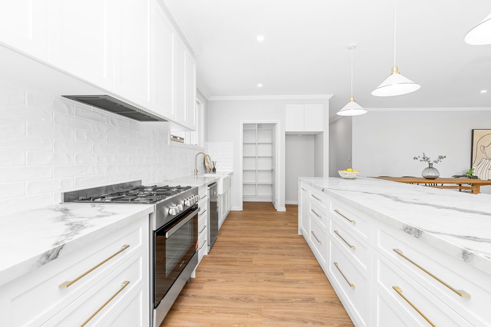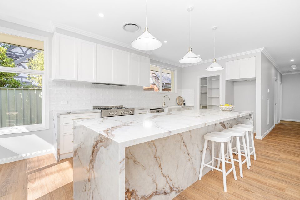 An open plan kitchen/dining area is at the heart of this renovation. With a large island bench and butler’s pantry, 40 mm stone benchtops and a five-burner cooktop, the kitchen is well equipped for entertaining or family dining with picturesque garden views.
