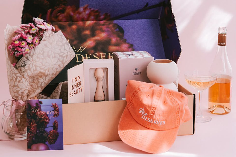 Other gifts can be added or purchased separately including a locally made ‘She Deserves’ cap and ‘Sparkling Sarah’ produced by Cofield Wines at Rutherglen.