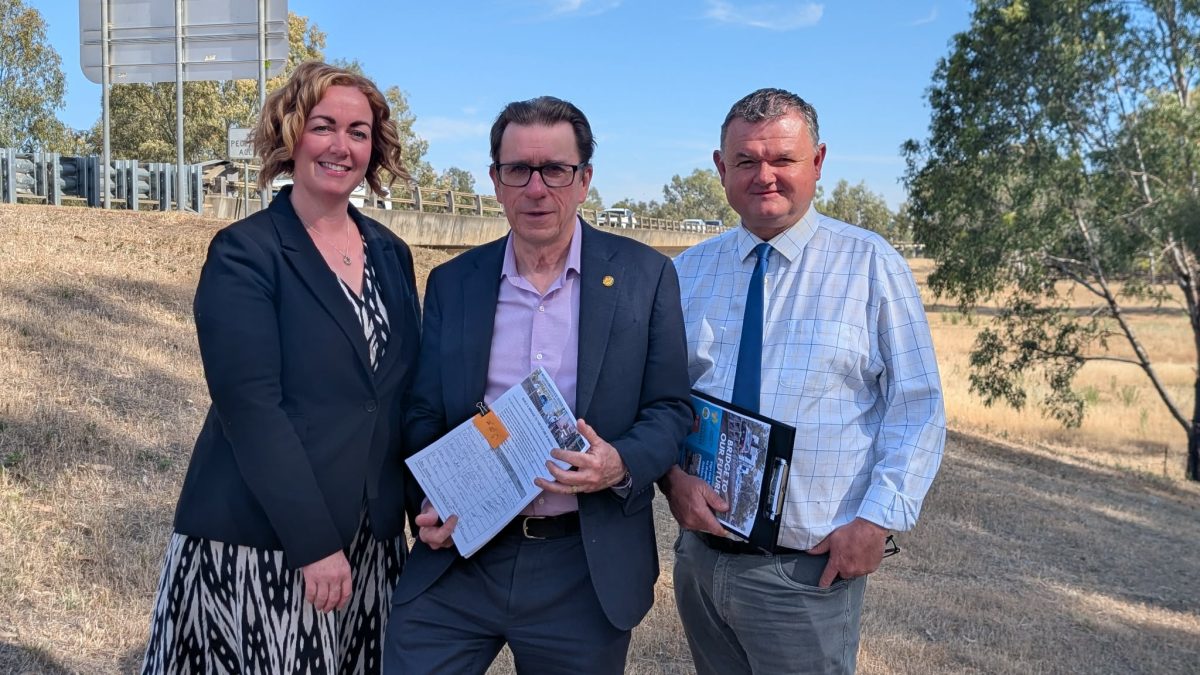 Member for Wagga Wagga Joe McGirr, Wagga Business Chamber manager Sally Manning and Committee 4 Wagga CEO Scott Sanbrook are pushing for 10,000 signatures on a petition to duplicate the Gobbagombalin Bridge. Photo: Jarryd Rowley.