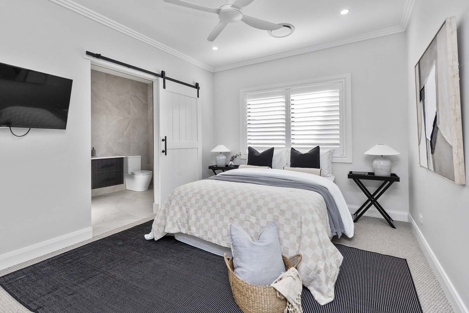A large main bedroom features a walk-in wardrobe and a large ensuite accessible through a barn door.