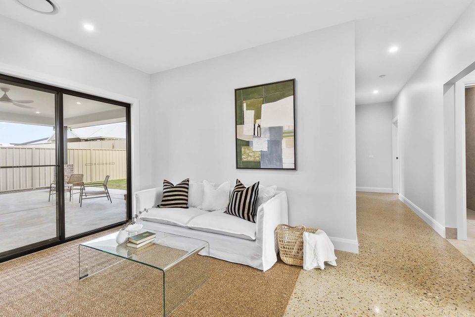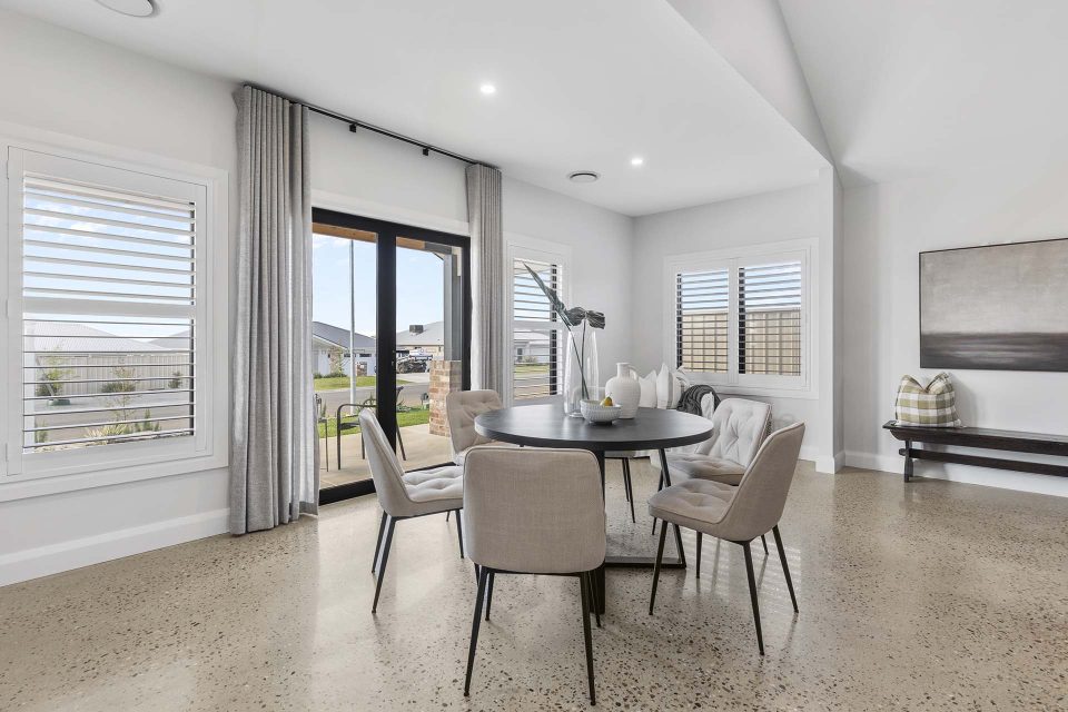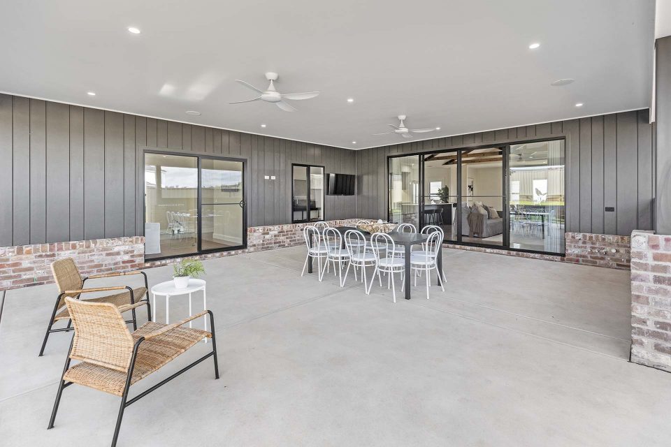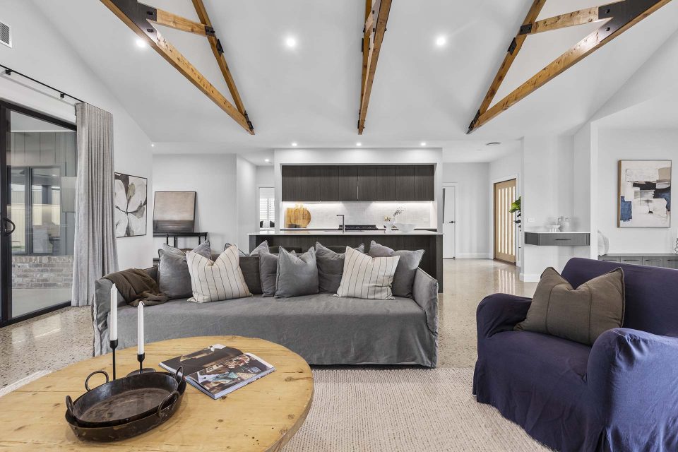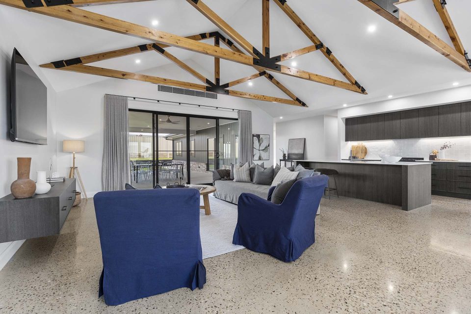 Characterised by a raked ceiling with decorative timber features, the living space is the centre of the home and it opens out to the large outdoor dining area.
