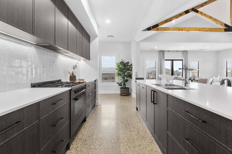 A premium kitchen serves the living space, with a large stone benchtop, Artusi appliances, a full butler’s pantry, extensive custom cabinetry and a double fridge space.