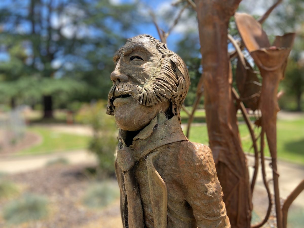 One piece in particular stands out among them as the only installation that is entirely unconnected to the military. The Jolly Swagman is a life-sized copper and bronze sculpture positioned on the eastern side of the gardens, just down the slope from the memorial wall and eternal flame.