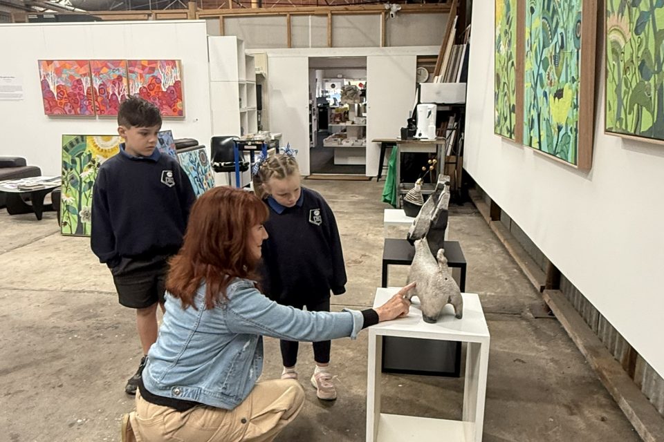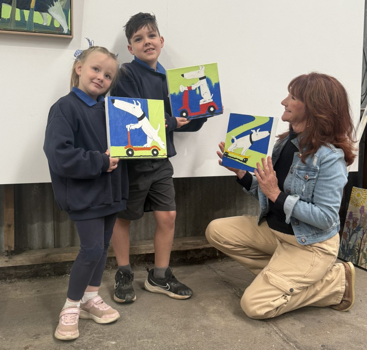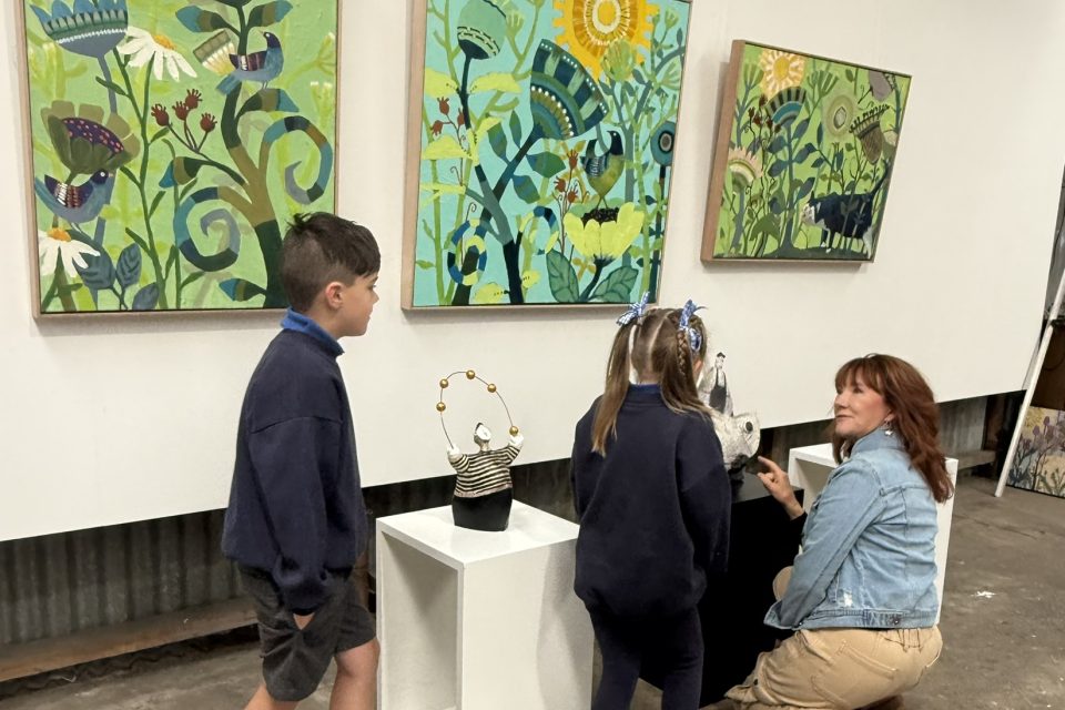 Jindera artist Jacqui Melbourne with Winnie, 5, and Jaeger, 8, from Thurgoona Public School and some of the works from her new exhibition. Photo: Minerva Taylor.