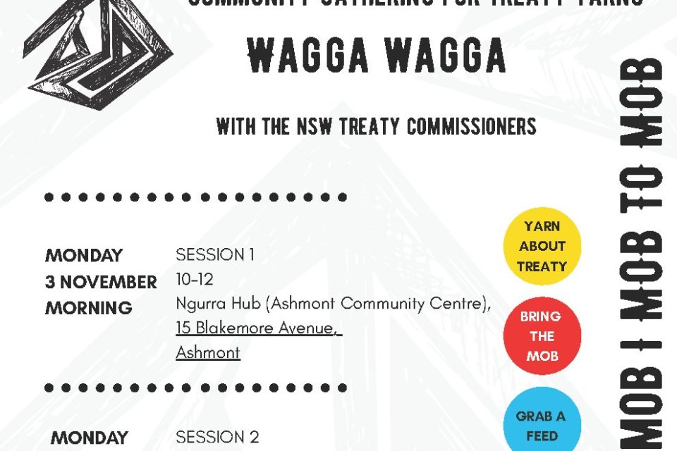 NSW Treaty Commissioner Aden Ridgeway will be in Wagga for two days: Friday, 31 October at Transgrid’s Discovery Hub at 10 am; Monday, 3 November at Ngurra Hub (Ashmont Community Centre) from 10 am to noon, and Tolland Community Centre from 2 to 4 pm.